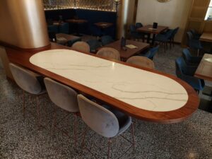 – Šank i sto u restoranu Milošević, Velika Vranjska Naš najnoviji projekat vodi nas u prelepu Vrnjačku Banju, gde smo u restoranu Milošević izveli elegantnu